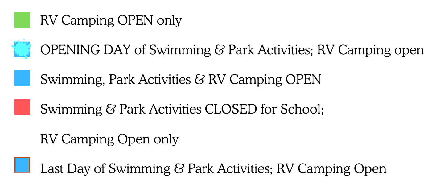 Swimming, Park Activities & Picnicking Season coincide with the area school schedule.